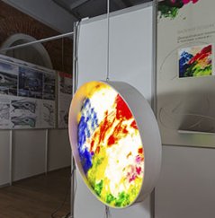В этом году Валерия представила на выставке «Декоративные панно в технике «Ленаж». Это универсальная техника, разработанная самой Валерией. Название образовано от французского «laine»- шерсть и «vitrage»- витраж. Каркас панно изготовлен компанией KARAT полностью из акрилового камня.