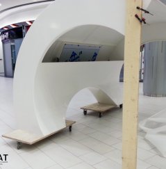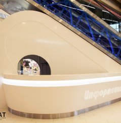 Основное назначение проекта – гардероб, совмещенный с информационной стойкой и витриной для сувениров. В техническом задании гардероб проектировался под определенное местоположение, необходимо было поместить изделие с обратной стороны эскалатора в здании новой Пристройки к ТРК «Питер Радуга». Это добавляло сложность конструкции и дополнительные условия при проектировании и монтаже.