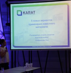 21 ноября, в рамках мероприятия, состоялась презентация компаний, готовых предложить сотрудничество промышленным дизайнерам. От лица компании KARAT с речью выступила Яна Олейникова - руководитель отделения квалификации и развития, которая рассказала о "5 новых вариантах применения акрилового камня". На презентации был развеян миф о том, что акриловый камень применяется исключительно для изготовления столешниц и подоконников. Для всех, кто не попал на эту презентацию, с материалами презентации можно ознакомиться по ссылке.