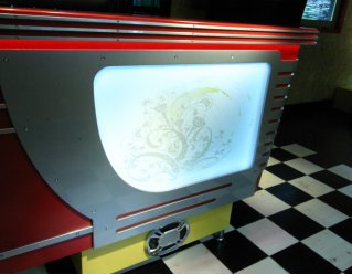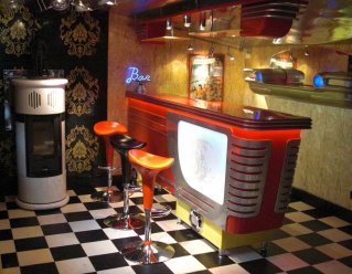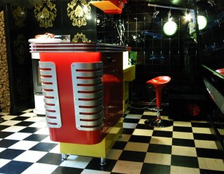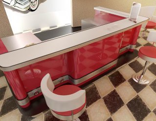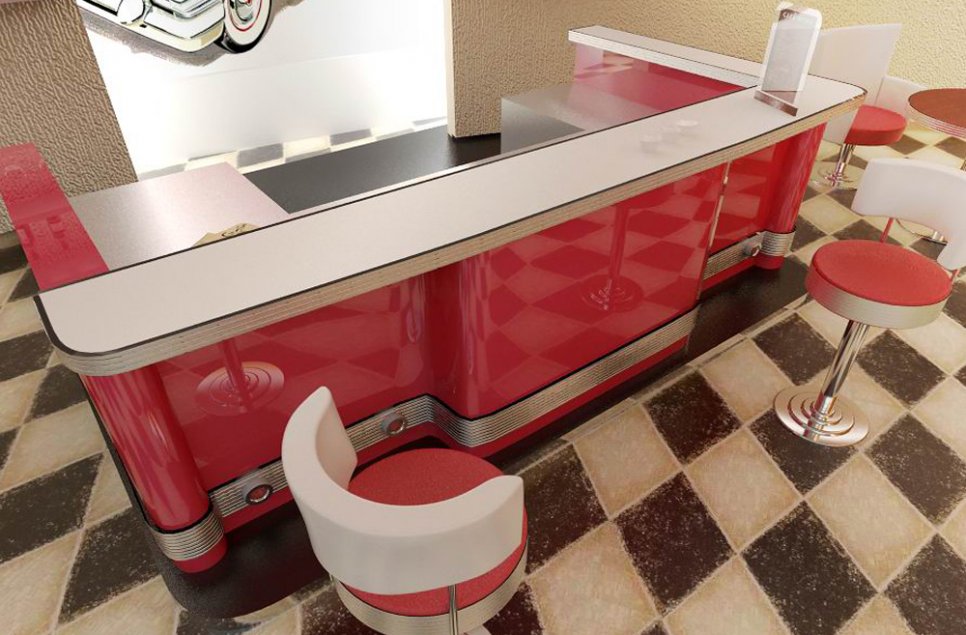 Барная стойка из акрилового камня в стиле Америки 50-х годов для частного интерьера. Индивидуальный дизайн. Собственное производство. Короткие сроки изготовления. Для заказа изделия звоните +7 (812) 309-98-41.