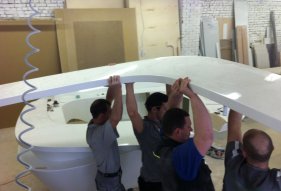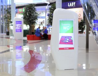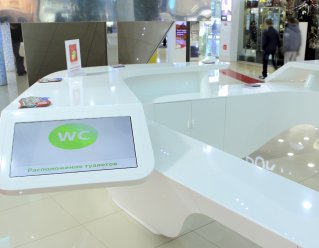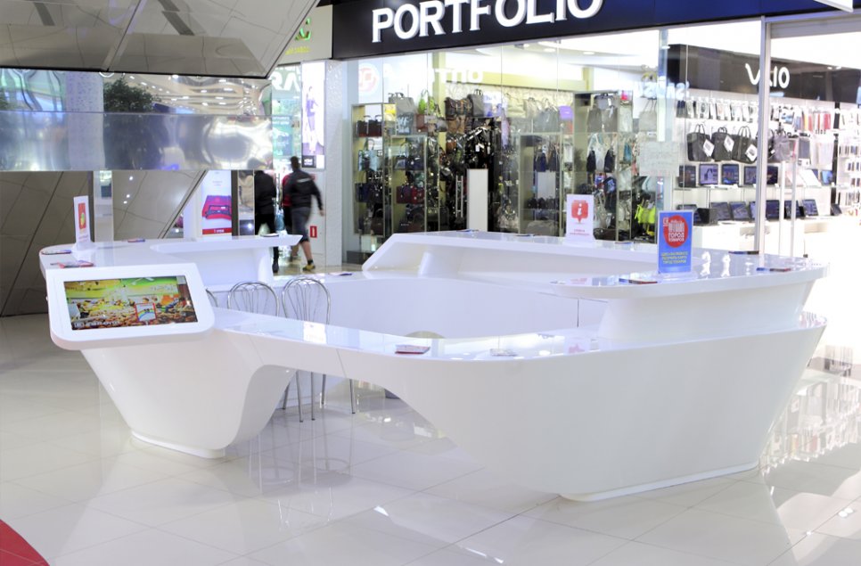 Для оснащения торгового центра "Европа" в г. Курск было изготовлено рекламное оборудование из акрилового камня. Это уникальная информационная стойка со встроенными мониторами, которая полностью оснащена всем необходимым для качественной работы администратора. Все коммуникации надежно спрятаны внутри изделия. Для информационной стойки так же разработана уникальная конструкция калиток, благодаря точным расчетам и слаженной работе монтажной бригады компании KARAT, дверцы плавно закрываются и открываются, что исключает возможность их повреждения. Рекламные напольные тотемы так же выполнены под ключ: изготовлены корпусы и встроена электроника.